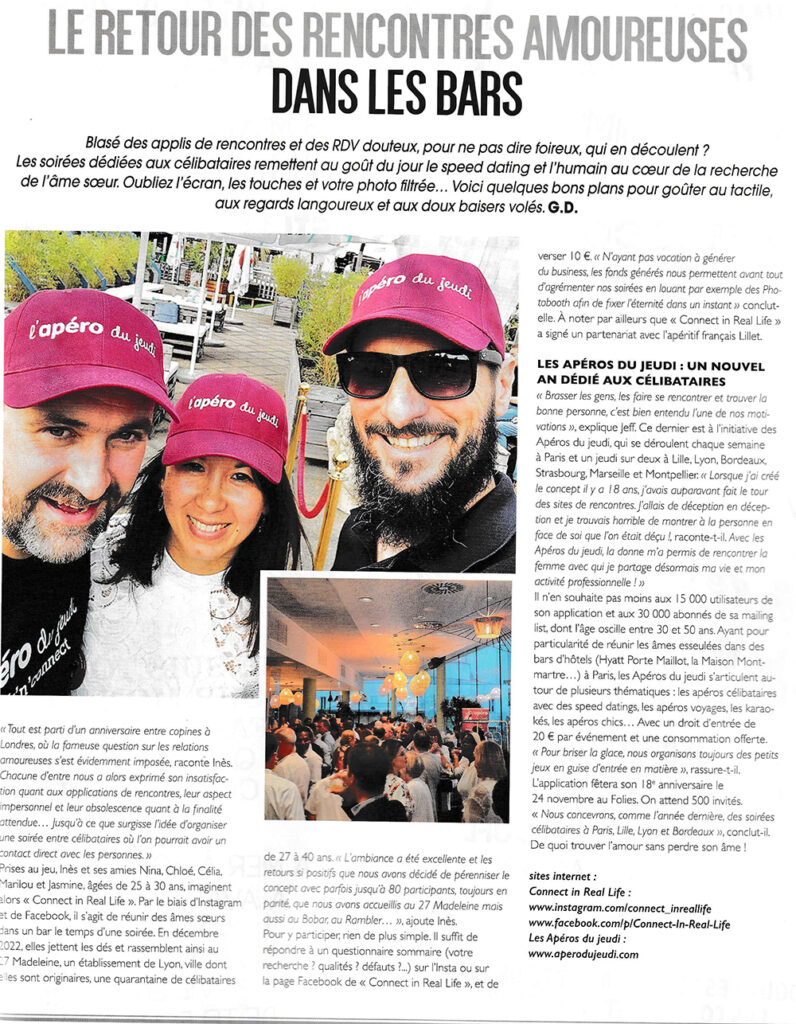 En novembre dernier, Bar Mag nous a fait l’honneur de m »interviwer pour un article qui colle parfaitement à l’Apéro du Jeudi : le retour des rencontres amoureuses dans les bars ! En tant que spécialiste du dating en vrai, des rencontres « in real life » depuis 18 ans, j’ai répond aux questions de Gérald Dudouet, autour de l’article. Extraits.